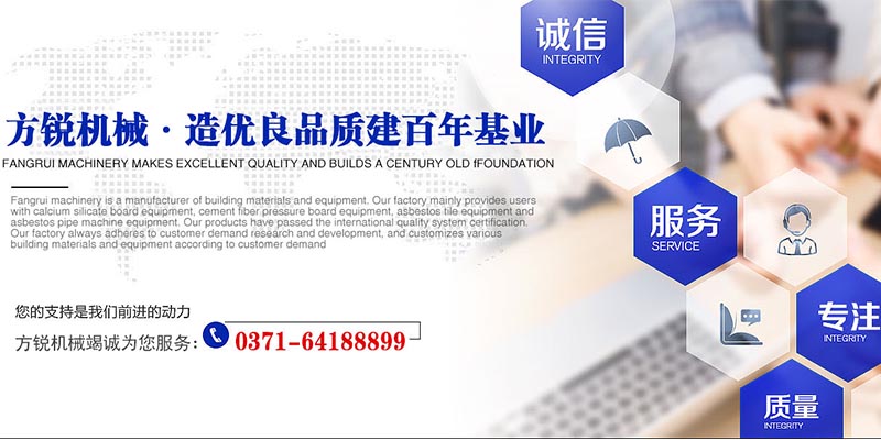 鄭州方銳正和機械制造有限公司在硅酸鈣板設備水泥纖維壓力板設備石棉瓦設備石棉管設備等新型建材領域有豐富的經驗成熟的工藝,公司位于河南省鄭州市鞏義市芝田鎮,多年來,公司匯集了一大批銳意進取并代表著行業水平的管理人員。公司非常重視技術交流與合作,引進了發達的好技術和工藝,在技術本土化的基礎上,我們一直在理性的探索,不斷創新,開發適合客戶需求的新產品。公司秉承以“以人才為根本,以市場為導向,以科技為基礎,以產業為標準、以質量為保證、以世界為目標。”的經營方針力求的設備服務于社會而努力。我公司經過多年不斷的努力,發展壯大,成為國內設備廠家。